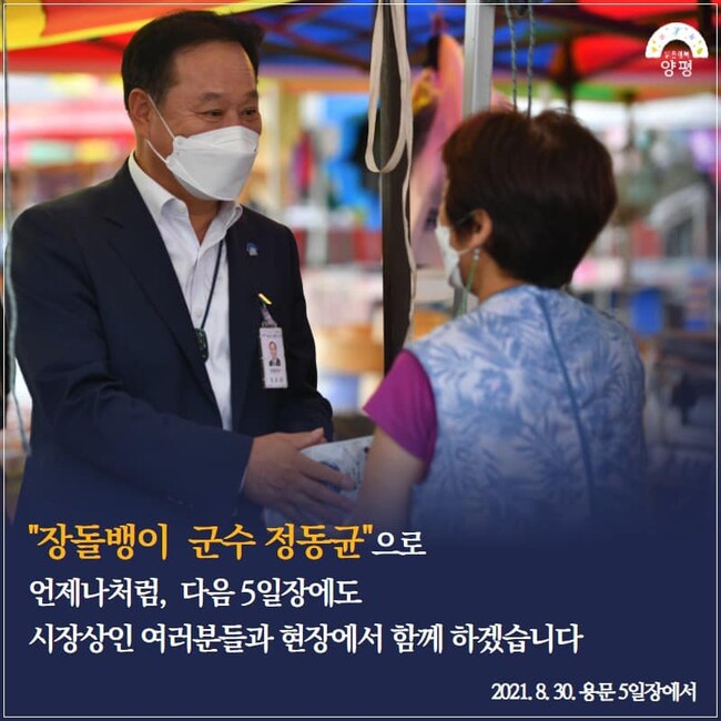 이어 양평군의 정서와 특색을 살린 전통시장 상권 구축으로 상인들이 행복하고, 수도권 주민에게 가장 사랑받는 전통시장으로 우뚝 설 수 있도록 양평시장 활성화에 최선의 노력을 다하겠다면서, 어느 비 오는 장날, 장을 찾은 저에게 상인 한 분께서 반갑게 웃으시면서 하신 참 듣기 좋고 기분 좋은 말씀이 생각난다며, "우리 군수님도 영락없는 장돌뱅이셔요,! 비가 오나 눈이 오나 5일 장마다 장에 나오시니, 장돌뱅이 군수님이라 불러드려야죠!" "따뜻한 정과 마음을 나누는 5일 장의 장돌뱅이 군수 정동균으로, 다음 5일 장에도 시장 상인 여러분들과 현장에서 함께 하겠다고 밝혔다.