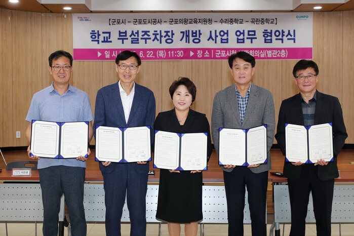 이를 위해 군포시는 6월 22일 군포시청에서 군포의왕교육지원청, 곡란중학교, 수리중학교, 군포도시공사와 학교 부설주차시설을 시민에게 개방하는 업무협약을 체결했다.