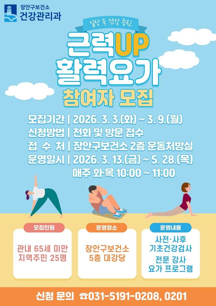 수원시 장안구보건소가 ‘근력업(UP) 활력요가’ 프로그램에 참여할 관내 65세 미만 지역주민 25명을 3월 3일부터 선착순으로 모집한다.