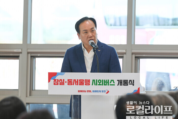| ▲ 이권재 오산시장이 ‘잠실·동서울행 시외버스 개통식’에 참석해 축사를 하고 있다. (사진출처=이권재 페이스북) |