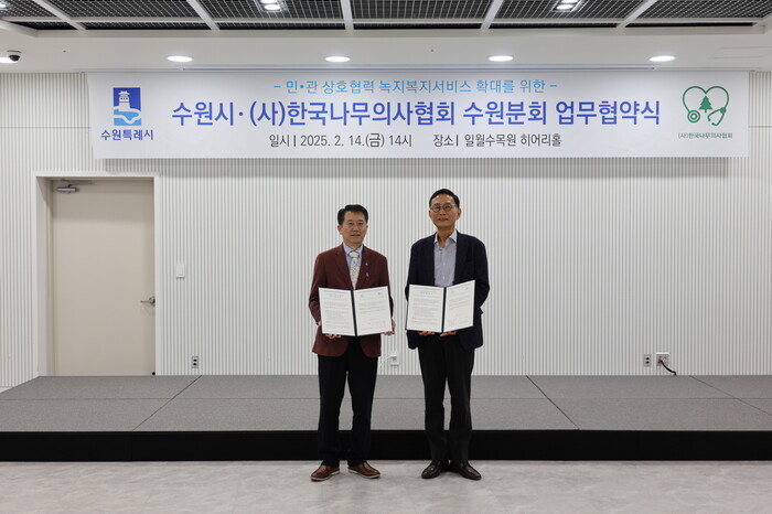 수원시(시장 이재준)가 14일 (사)한국나무의사협회 수원시분회와 민·관 상호협력 녹지복지서비스 확대를 위한 업무협약을 체결했다.