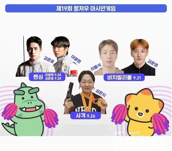 그러면서 항저우 아시안게임 화성시 선수 출전 일정을 사격 심은지 : 9. 26.(화), 펜싱 이광현(단체) : 9. 27.(수), 김준호(단체) : 9. 28.(목)로 전했다.