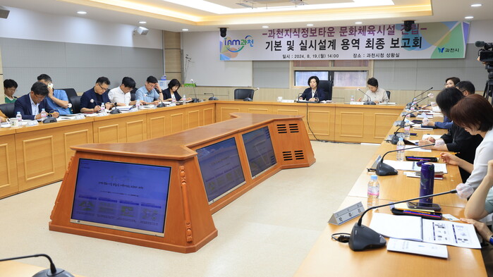 과천시가 과천지식정보타운 문화체육시설 건립에 박차를 가하고 있는 가운데, 19일 시청 상황실에서 ‘과천지식정보타운 문화체육시설 건립 공사 기본 및 실시설계 용역 최종보고회’를 개최했다.