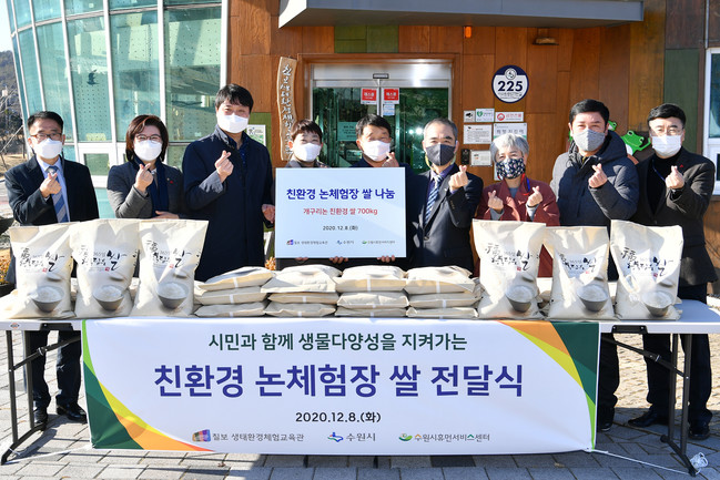 수원시는 8일 칠보 생태환경체험교육관에서 ‘친환경 논 체험장 쌀 전달식’을 열고, 올해 수확한 친환경 쌀 700㎏(7㎏ 100포대)을 기부했다. 수원시휴먼서비스센터를 통해 100가정에 전달할 예정이다.