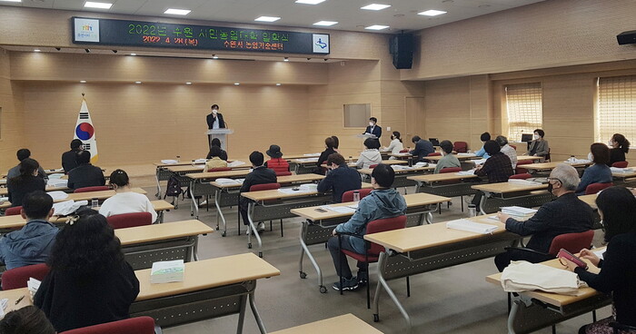 사진/ 4월 28일 수원시농업기술센터 대강당에서 열린 ‘2022년 수원시 시민농업대학’ 입학식(사진제공=수원시)