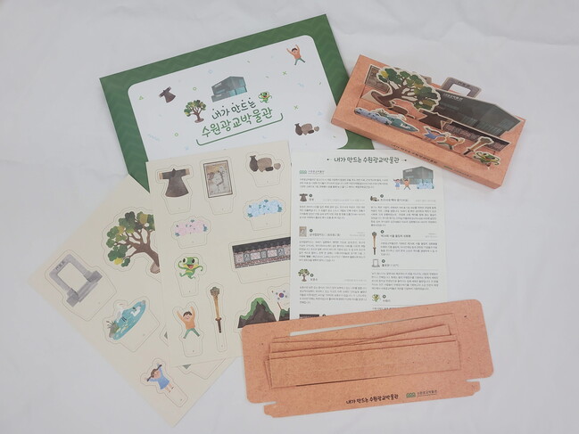 ‘내가 만드는 수원광교박물관’은 수원광교박물관 유물, 주변 문화유산 자료를 자신이 원하는 대로 배치하고, 꾸밀 수 있는 키트이다. 유물·문화유산 설명지도 들어있다.