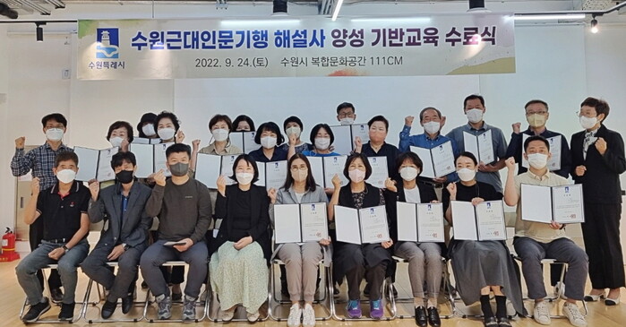 수원시가 24일 수원시 복합문화공간 111CM에서 ‘수원 근대 인문기행 해설사 양성 기반교육’ 수료식을 열고, 수료생 21명에게 수료장을 수여했다.