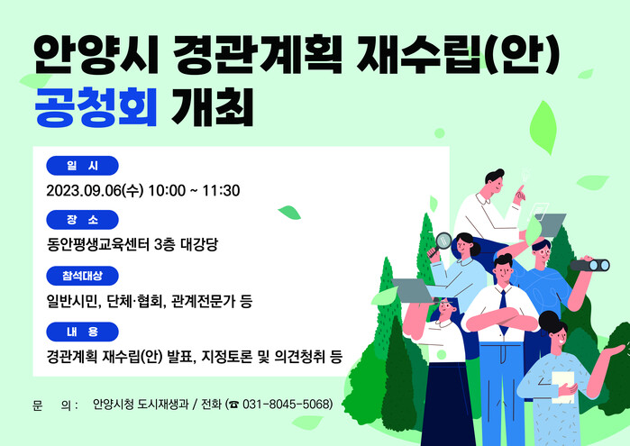 안양시 경관계획 재수립(안)은 지난 2016년 수립한 시 경관계획에 대한 재검토 및 재정비하는 것이다. 권역·축·거점별 적합한 경관 추진전략과 건축물·열린쉼터·공공시설물·옥외 광고물·색채·야간경관 등에 대한 설계기준이 제시돼 아름다운 도시경관 형성을 유도할 수 있는 기본 틀을 담고 있다.