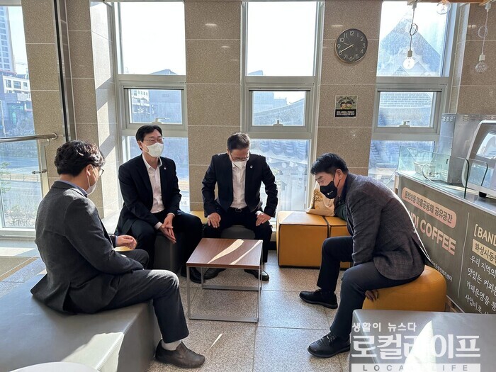 | ▲ 정명근 화성시장(왼쪽 두번째)이 동탄8동 행정복지센터 반디커피에서 직원·시의원들과 환담을 나누고 있다. (사진출처=정명근 페이스북) |
