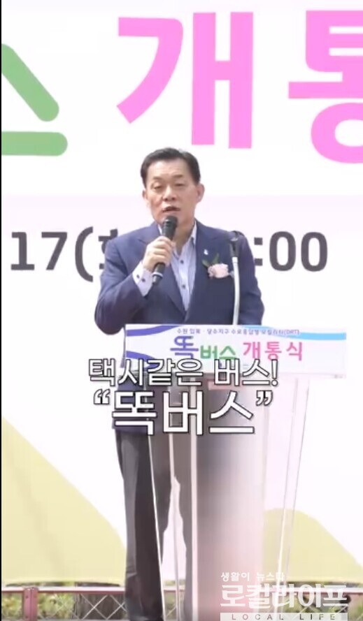 | ▲ 이재준 수원특례시장이 입북·당수 지역 똑버스 3단계 개통식에 참석해 축사를 하고 있다. (사진출처=이재준 페이스북 영상 갈무리) |