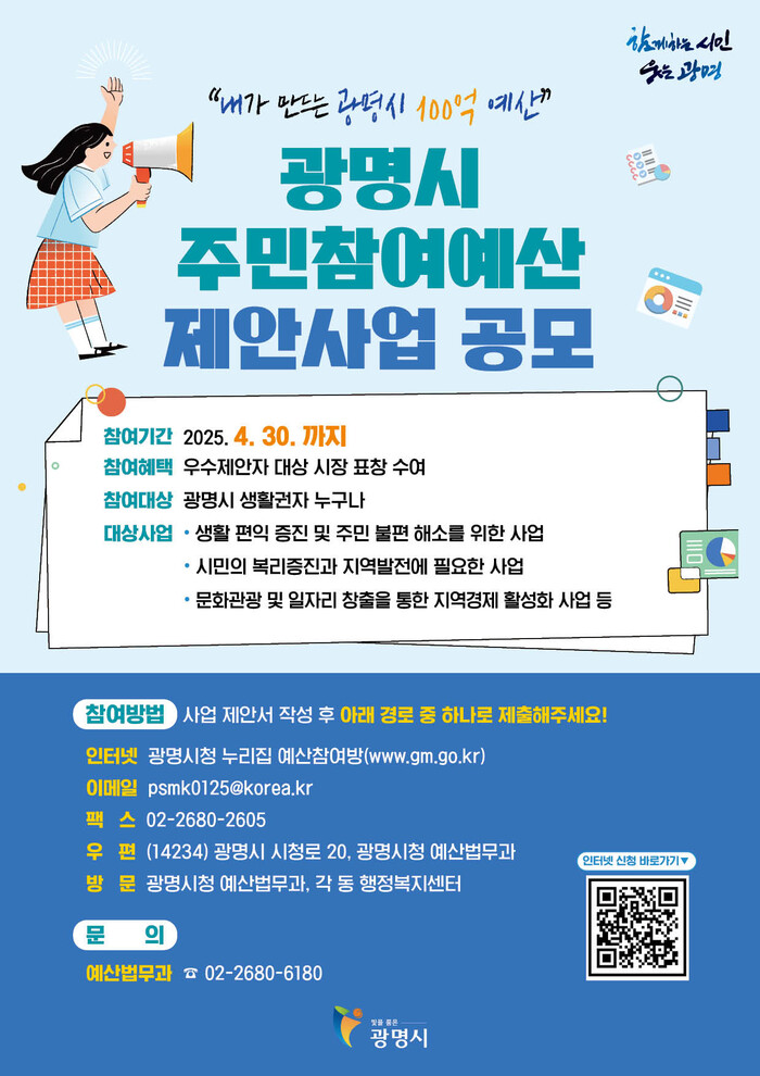 사업 제안은 광명시청 누리집(gm.go.kr) 세금·예산 메뉴의 예산참여방 게시판에서 할 수 있으며, 광명시청 예산법무과와 동 행정복지센터를 방문하거나 우편으로 참여할 수 있다.
