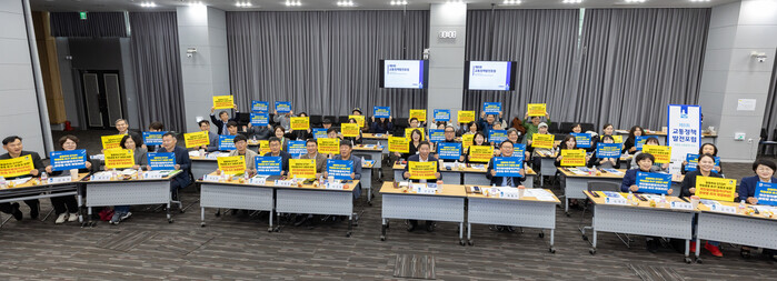 사진/교통정책발전포럼 참석자들이 개인형 이동장치 관련법 제정을 촉구하는 내용이 담김 손팻말을 들고 있다.(사진제공=수원시)