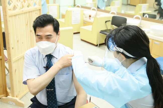 이날 김 시장은 코로나19 1차 대응요원 중 재난안전대책본부장 자격으로 백신을 접종했다.