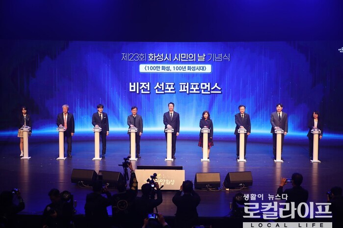 | ▲ 정명근 화성시장(가운데)이 '제23회 화성시 시민의 날 기념식'에서 <100만 화성, 100년 화성시대> 비전 선포 퍼포먼스에 참여하고 있다. (사진출처=정명근 페이스북) |