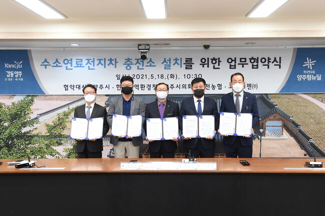 양주시(시장 이성호)는 18일 시청 상황실에서 한강유역환경청, 양주시의회, 회천농업협동조합, 코하이젠 주식회사와 손잡고 경기북부 최초로 ‘수소연료전지차 충전소 설치를 위한 업무협약’을 체결했다고 밝혔다.