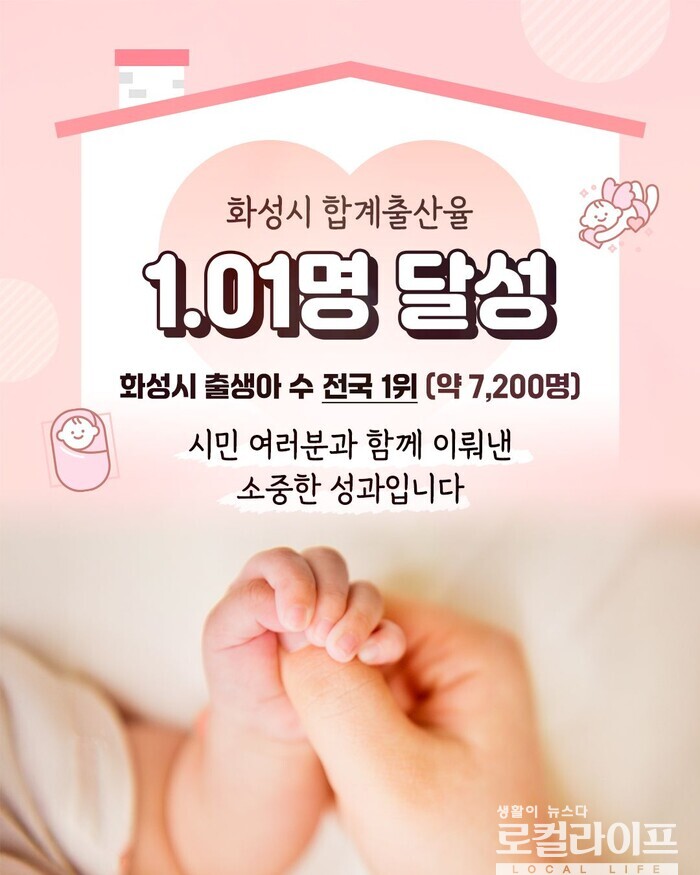 이와 관련해 정명근 화성특례시장은 28일, 자신의 페이스북을 통해 “우리 화성특례시의 2024년 출생아 수가 7200명으로 전국 1위를 했다”고 밝혔다.
