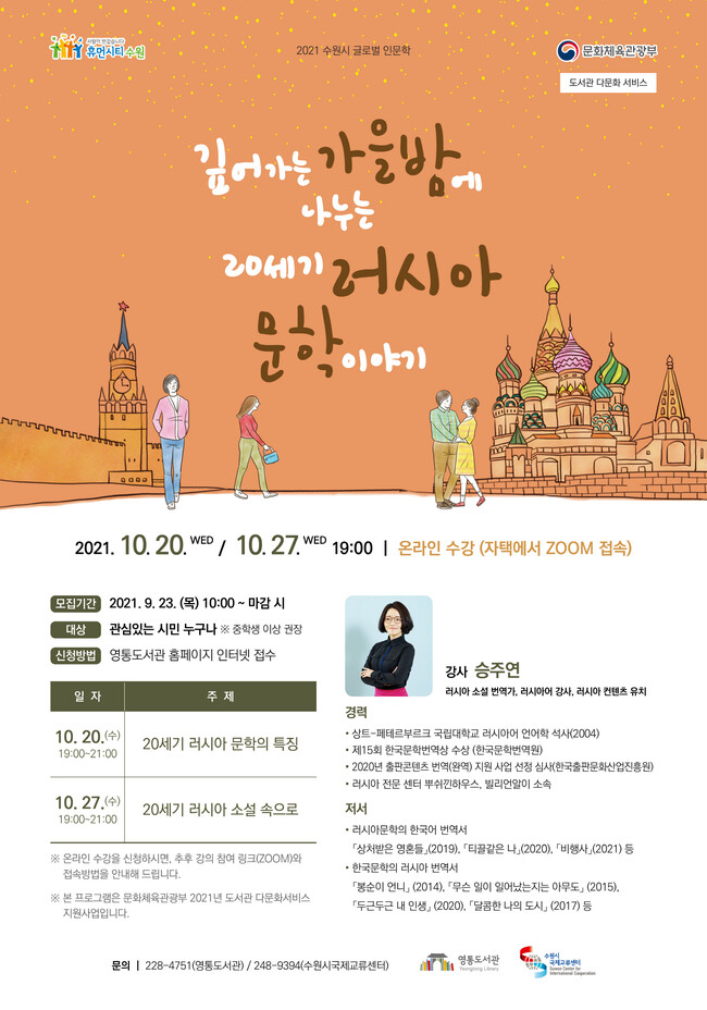 수원시 영통도서관이 2021년 글로벌 인문학 ‘깊어가는 가을밤에 나누는 20세기 러시아 문학 이야기’에 참여할 수강생 100명을 9월 23일부터 선착순으로 모집한다.