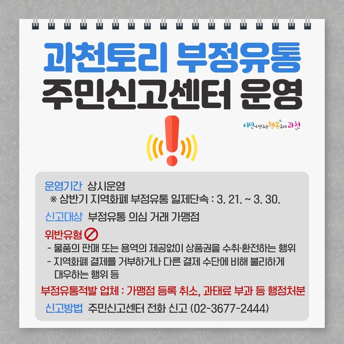 과천시는 지역화폐(과천토리) 발행 확대에 따른 부정유통 우려를 해소하기 위해 오는 30일까지 지역화폐 가맹점을 대상으로 일제단속을 실시한다고 21일 밝혔다.