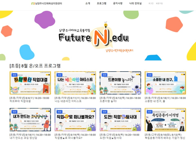 이번 여름방학 미래교육은 관내 청소년의 진로 개발을 위해 학교 안팎을 연결하며 연간 3만 여명이 넘는 학생들에게 진로 교육을 제공하고 있는 남양주시 인재육성지원센터가 운영한다.