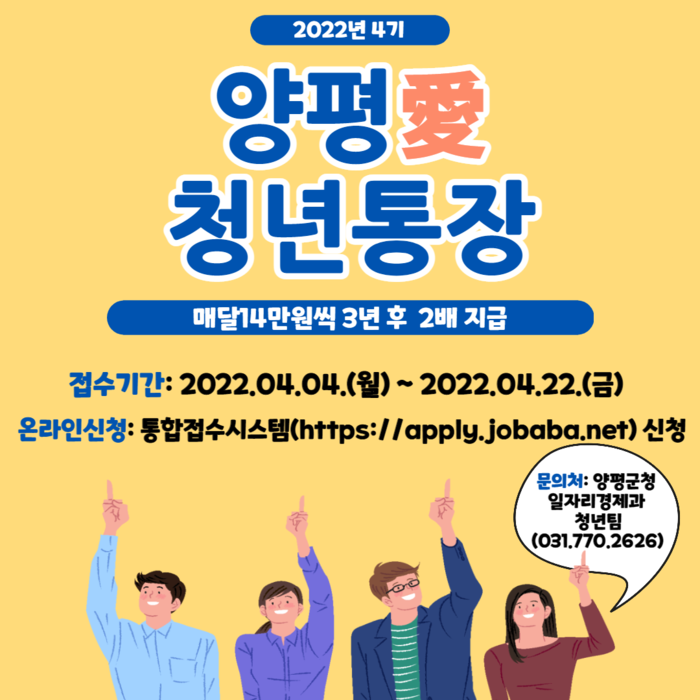 양평군(군수 정동균)에서는 청년들의 관내 취업을 촉진하고 장기근속 및 지역정착을 유도하기 위해 근로지원금을 지원하는 ‘2022년 양평愛 청년통장’ 참여자를 모집할 예정이라고 밝혔다. .