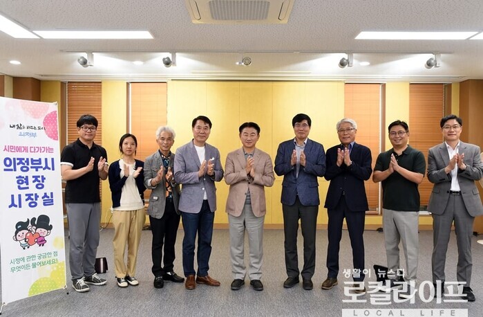 | ▲ 김동근 의정부시장(가운데)이 용현산업단지 현장시장실 후 참석자들과 기념촬영을 하고 있다. (사진출처=김동근 페이스북) |