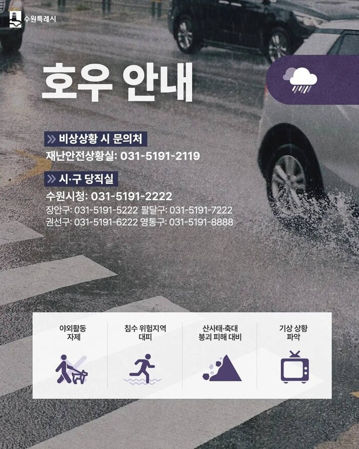 이어 수원시는 시민 안전을 최우선으로 두고 관내 배수펌프장을 비롯한 주요 시설물 점검, 각 구청 및 동 행정복지센터와의 비상 대응 체계 유지, 저지대‧하천변‧지하차도 등 침수 우려 지역에 대한 순찰을 강화하고 있다고 밝혔다.