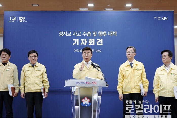 | ▲ 신상진 성남시장(가운데)이 기자회견을 갖고 정자교 붕괴 사고에 대해 사과하며 재발방지 대책을 밝혔다. (사진제공=성남시) |