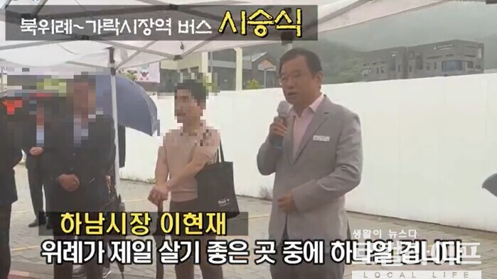 | ▲ ‘북위례~가락시장역 36번 버스 시승식’에서 이현재 하남시장이 인사말을 하고 있다. (사진출처=이현재 페이스북 영상 갈무리) |