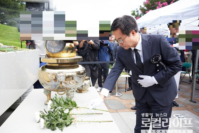| ▲ 김동연 경기도지사가 ‘김대중 대통령 서거 14주기 추도식’에 참석해 헌화하고 있다. (사진출처=김동연 페이스북) |