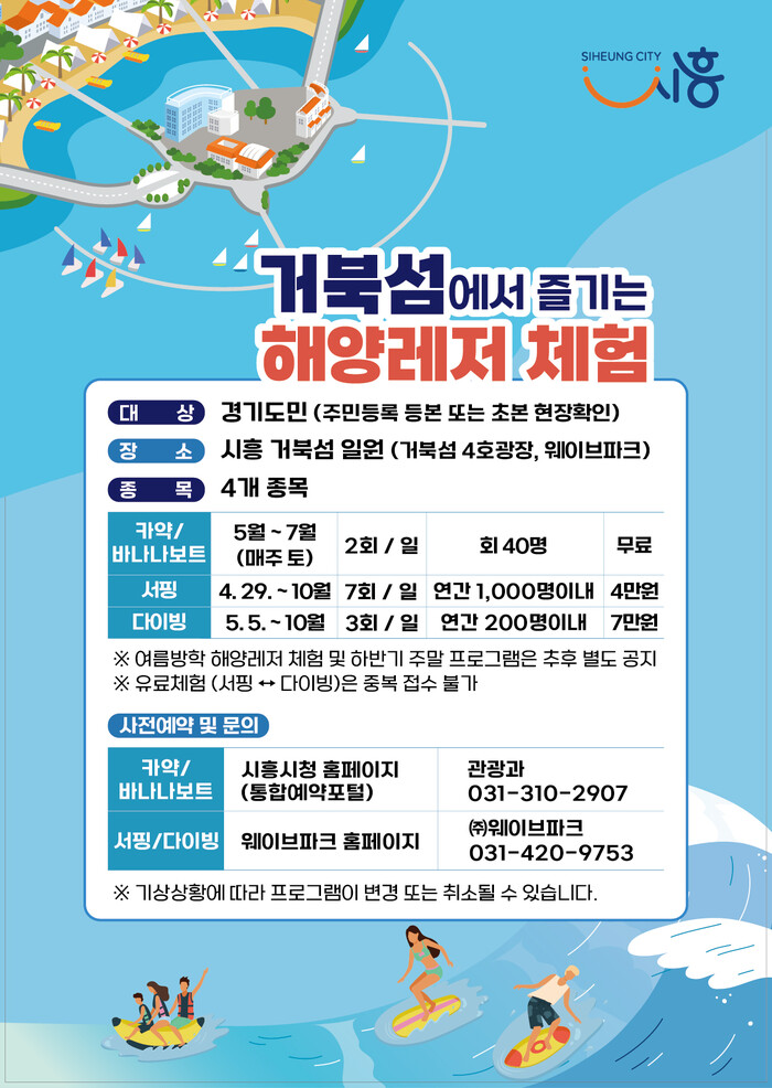 시흥시(시장 임병택)는 오는 29일부터 시흥 거북섬 일대에서 ‘거북섬에서 즐기는 해양레저 체험’이라는 주제로 다양한 체험프로그램을 진행해 해양레저 저변 확대에 나선다.