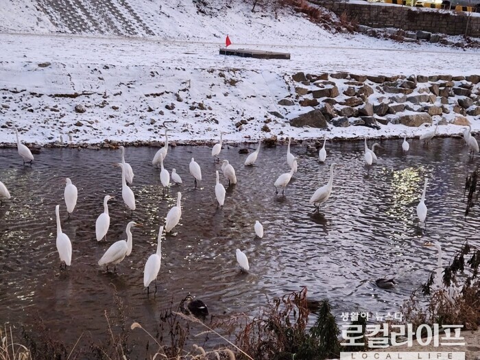 [안양=로컬라이프] 송준형 기자 = 대표적인 겨울철새인 백로 떼가 안양 학의천을 찾았다.