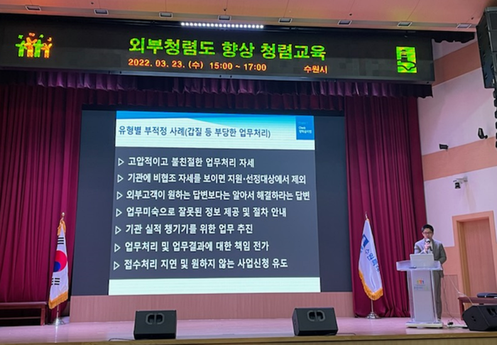 수원시 공직자들이 사용하는 ‘행정포털’에서 실시간으로 중계한 이번 교육은 각종 인허가, 보조금 지급, 공사·용역 관련 업무 등을 담당하는 공직자 600여 명을 대상으로 진행했다.