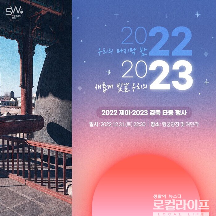 [수원=로컬라이프] 송준형 기자 = 수원특례시는 12월 31일, 화성행궁광장에서 제야음악회와 제야타종 행사를 개최한다.