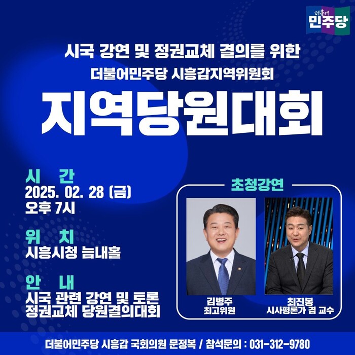 이와 관련해 김 의장은 24일, 자신의 페이스북을 통해 오는 2월 28일(금) 오후 7시, 시국 강연 및 정권교체 결의를 위한 더불어민주당 시흥갑지역위원회 지역당원대회가 다음과 같이 열린다고 밝혔다.