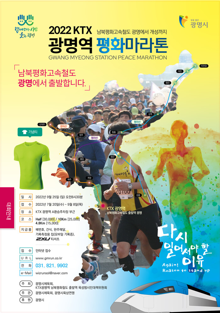 ‘2022 KTX광명역 평화마라톤대회’ 전반에 대한 자세한 사항은 주관 대행사(☎031-821-9902) 또는 광명시 체육회(☎02-899-9400)로 문의하면 된다.