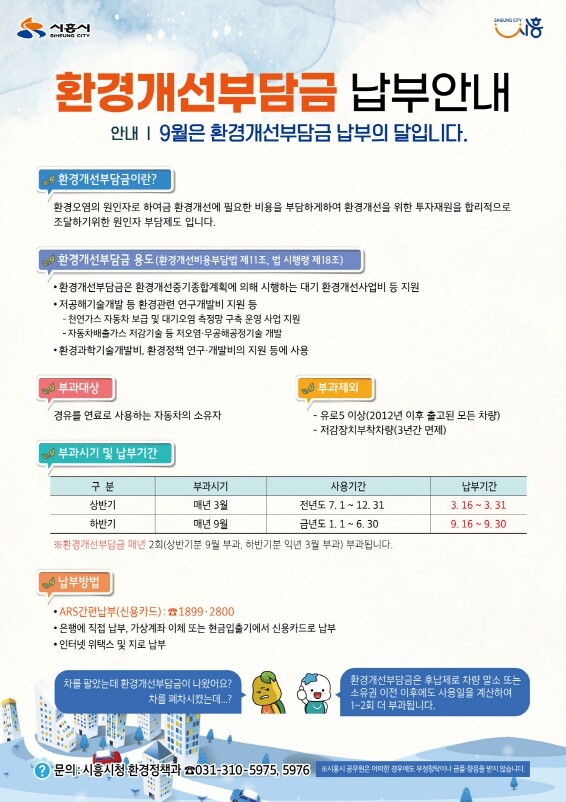 시흥시(시장 임병택)가 관내 경유차 1만 5천대에 2022년 2기분 환경개선부담금 8억 7천만 원을 부과하고 지난 13일 고지서를 발송했다.
