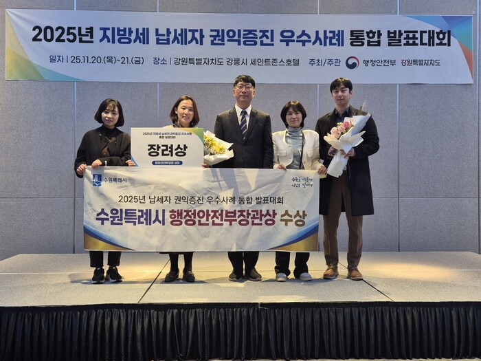 수원특례시(시장 이재준)가 행정안전부 주관으로 20~21일 강릉시 세인트존스호텔에서 열린 ‘2025년 납세자 권익 증진 우수사례 통합 발표대회’에서 장려상을 받았다.
