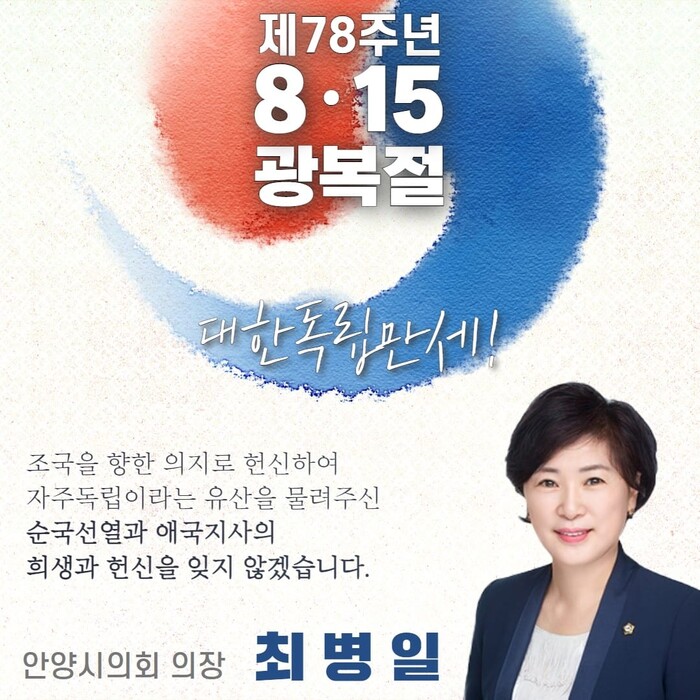 이와 관련해 최병일 안양시의회 의장은 15일, 자신의 페이스북을 통해 광복(光復)이라는 말은 “빛을 되찾다”라는 의미다. 하지만 빛을 되찾다라는 단순한 뜻을 넘어 우리 애국지사들이 추구했던 독립의 가치, 즉 자주와 평화를 나타내는 말이기도 하다고 밝혔다.