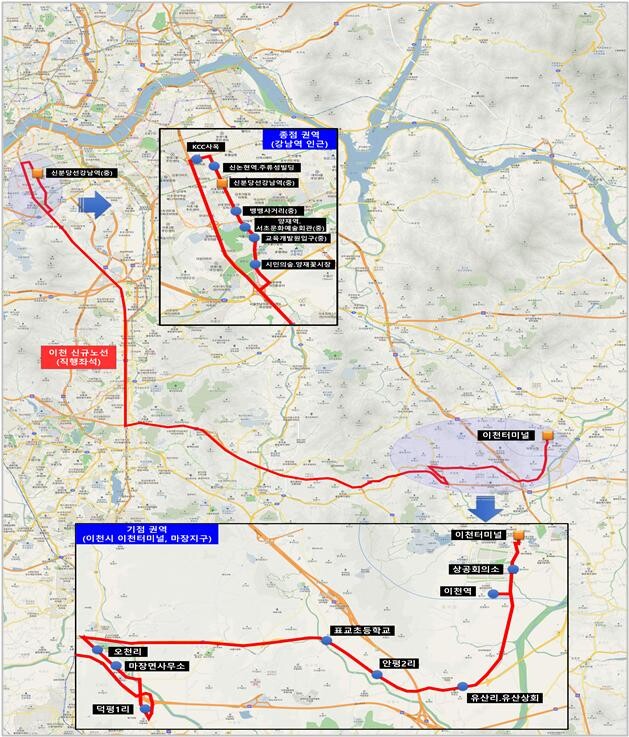 이천터미널~강남역 신규노선의 운행경로는 상행 이천터미널에서 출발하여 상공회의소, 이천역, 유산리. 유산상회, 안평2리, 표교초등학교, 오천리, 마장면사무소, 덕평1리, KCC사옥, 신논현역. 주류성빌딩, 신분당선 강남역(중)까지 운행하며, 하행 뱅뱅사거리(중), 양재역. 서초문화예술회관(중), 교육개발원입구(중), 시민의숲. 양재꽃시장, 덕평1리, 마장면사무소, 오천리, 표교초등학교, 안평마트앞, 유산리. 유산상회, 이천역, 상공회의소, 이천터미널까지 운행한다.