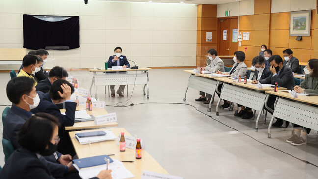 사진/오후석 용인시 제1부시장이 10일 용인시청에서 열린 2022년 경기도종합체육대회 추진상황보고회에서 관계자들과 이야기를 나누고 있다.(사진제공=용인시)