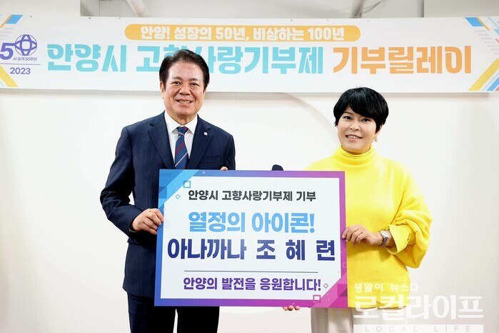 [안양=로컬라이프] 송준형 기자 = 개그우먼 조혜련 씨가 ‘안양시 고향사랑기부제’ 기부릴레이에 참여했다.