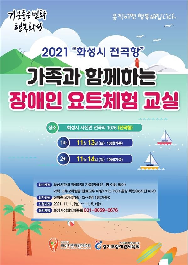 가족과 함께하는 장애인 요트체험 교실과 관련한 자세한 사항은 화성시장애인체육회(031-8059-0676)으로 문의하면 된다.