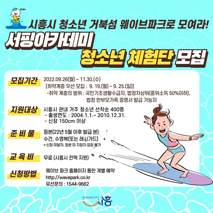 시흥시(시장 임병택)는 ‘시흥시 청소년, 거북섬으로 모여라!’라는 주제로 오는 19일부터 시흥시 청소년 400여 명을 대상으로 서핑 체험단을 모집한다고 밝혔다.