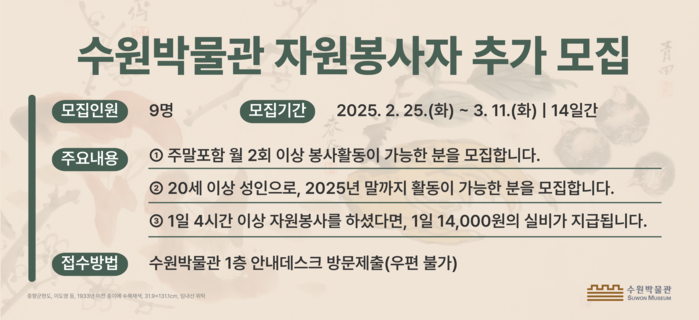 신청 서류를 작성해 수원박물관 1층 안내데스크에 제출하면 된다. 주말 근무 가능자, 박물관·교육 관련 전공자, 유관기관 경력자를 우대한다. 자세한 내용은 수원박물관 홈페이지에서 확인할 수 있다.