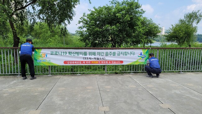 수원시는 관내 공원 94개소에 야외 음주행위 금지 행정명령을 알리는 현수막 110개를 게시했다. 11일까지 행정명령을 집중적으로 계도할 계획이다. 또 단속반을 편성해 행정명령 준수 여부를 지속해서 점검할 예정이다.