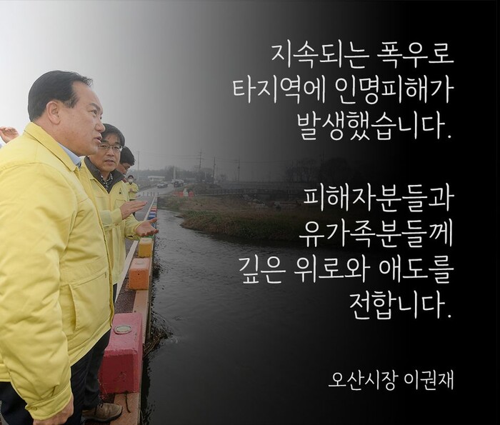 이어 “안전은 아무리 대비해도 부족함이 없다”며 “시민 여러분 역시 오산천 산책로 등 위험 지역 통행을 자제해 주시고 안전사고에 각별한 주의 부탁드린다”고 말했다.