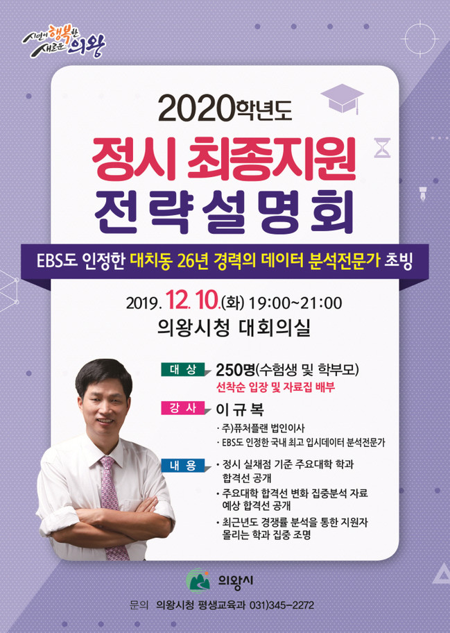 [의왕=로컬라이프] 송준형 기자 = 의왕시(시장 김상돈)는 오는 10일 오후 7시 시청 대회의실에서 2020학년도 대입 정시 최종지원 전략설명회를 개최한다.