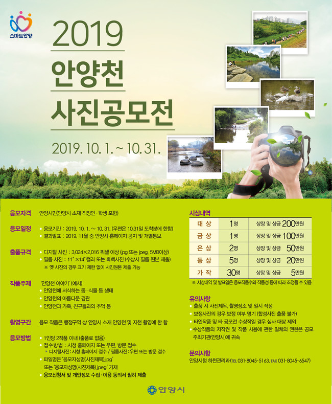 응모는 10월까지 그간 촬영한 안양천 사진을 신청서에 개인정보수집동의서와 함께 시(하천관리과 안양천가꾸기팀 8045-5163)에 제출하면 된다.