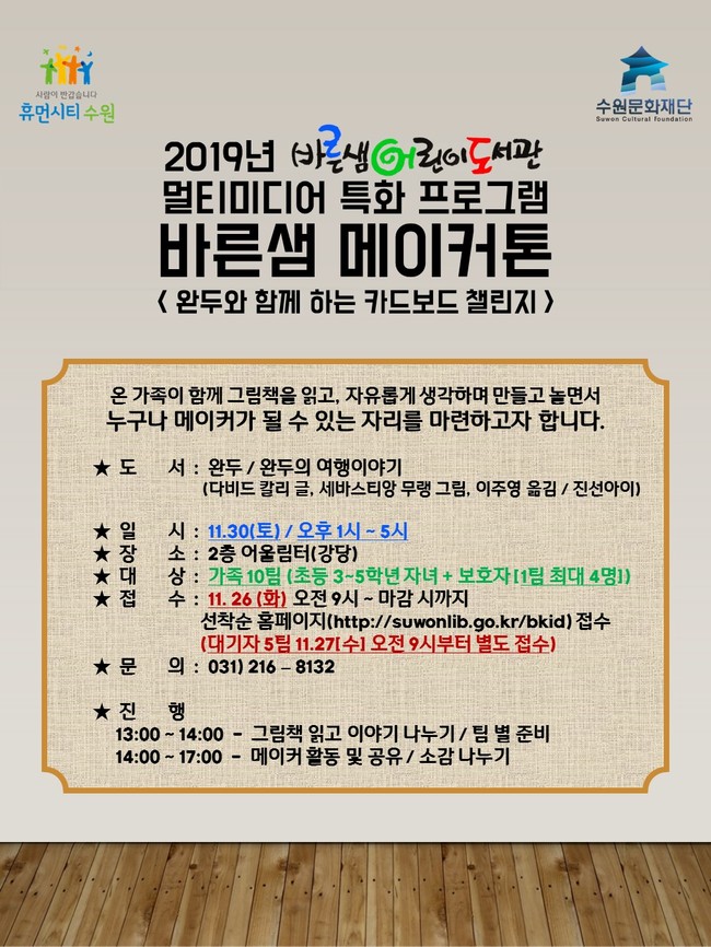 [수원=로컬라이프] 송준형 기자 = 수원문화재단(대표이사 박래헌)은 오는 30일 바른샘어린이도서관에서 초등학생과 그 가족을 대상으로 ‘바른샘 메이커톤:카드보드 챌린지’ 프로그램을 운영한다.