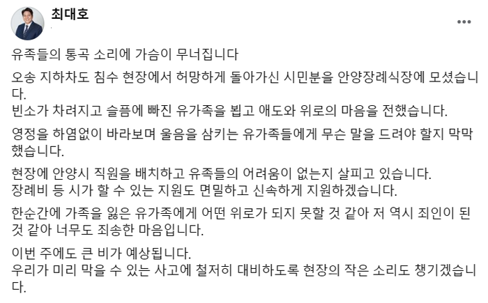 최 시장은 자신의 페이스북을 통해 “유족들의 통곡 소리에 가슴이 무너진다. 오송 지하차도 침수 현장에서 허망하게 돌아가신 시민분을 안양장례식장에 모셨다”며 “빈소가 차려지고 슬픔에 빠진 유가족을 뵙고 애도와 위로의 마음을 전했다”고 밝혔다.